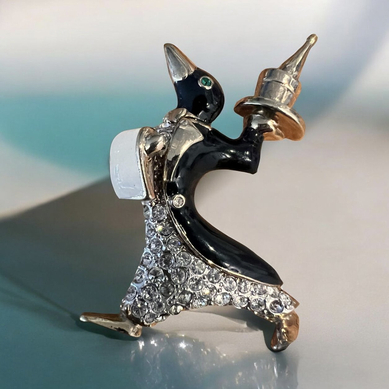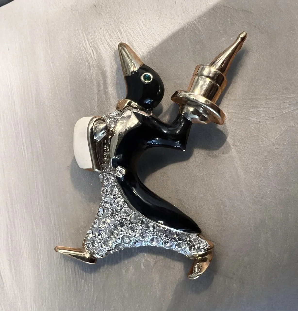 Vintage from the 1980s Charming penguin brooch with black enamel body. Sparkling rhinestone adds shine. Gold-tone accents and white enamel details. Cute collectible pin.