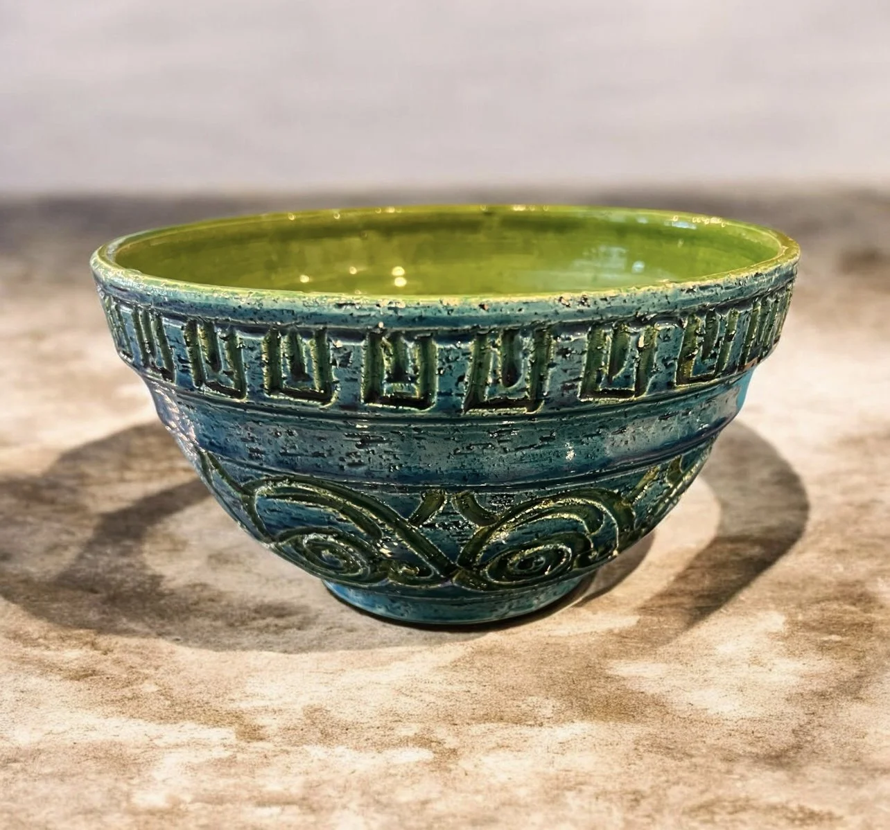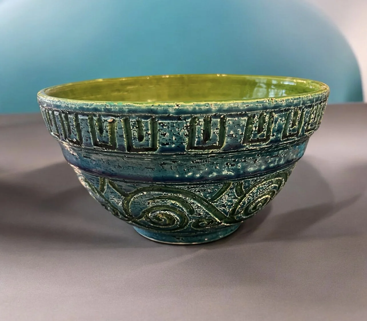 Enameled ceramic bowl in the colors and classic decorations of Aldo Londi for Bitossi.