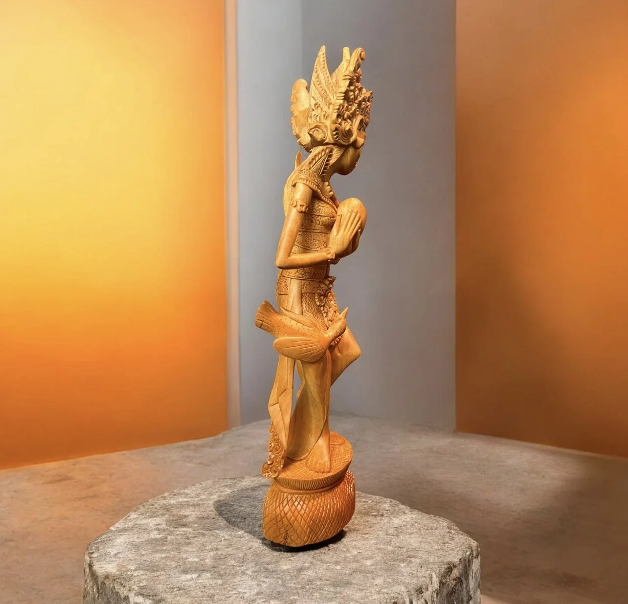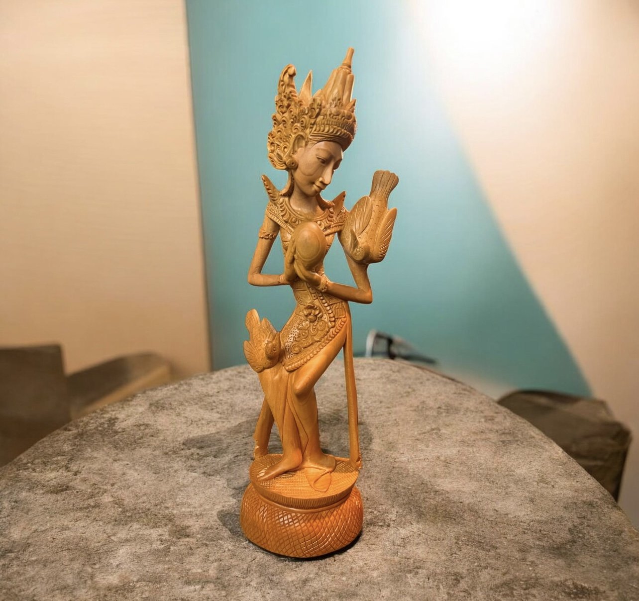 CROCODILE-WOOD CARVED ART DECO STYLE FINE SCULPTURE of Dewi Saraswati, the goddess of knowledge, music and wisdom.