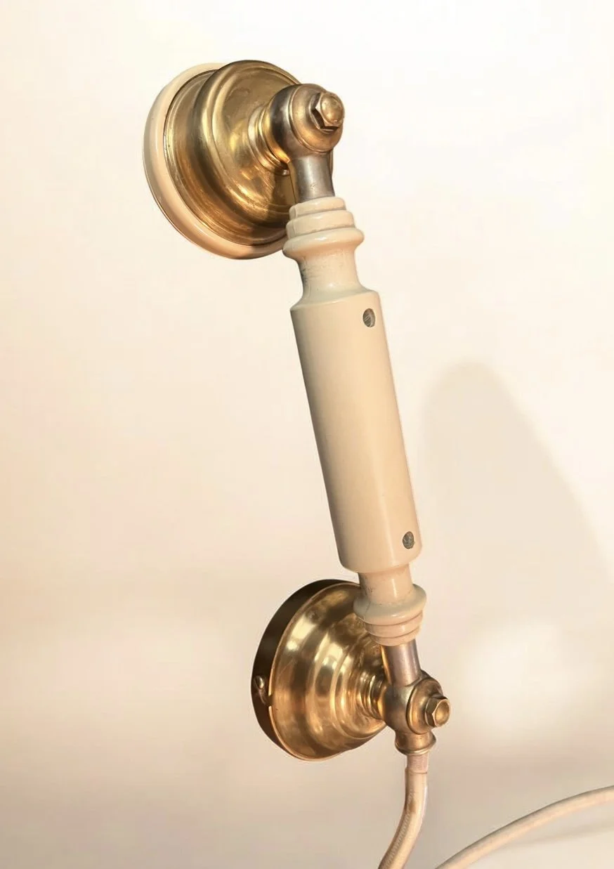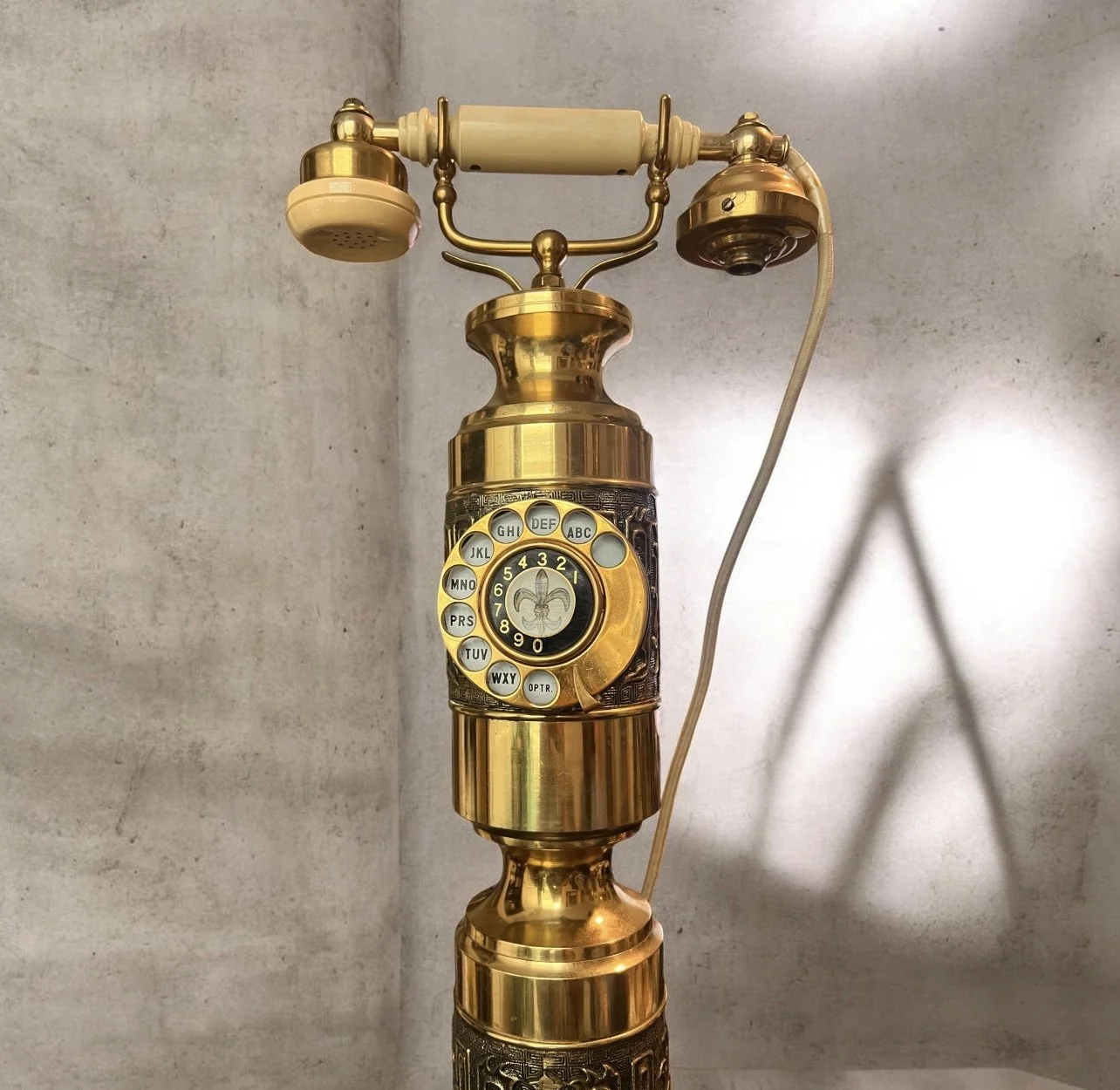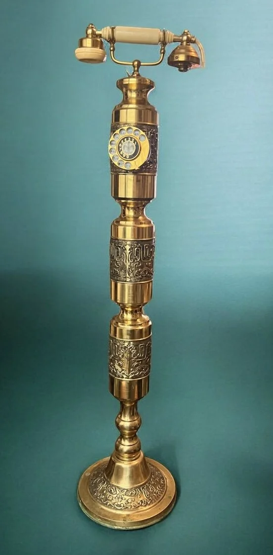 1960s vintage tall standing rotary phone, often described as a Hollywood Regency or Art Deco style pedestal telephone made of thick, ornate brass.