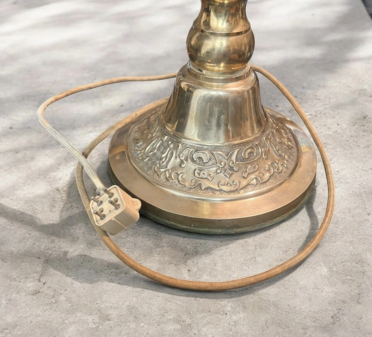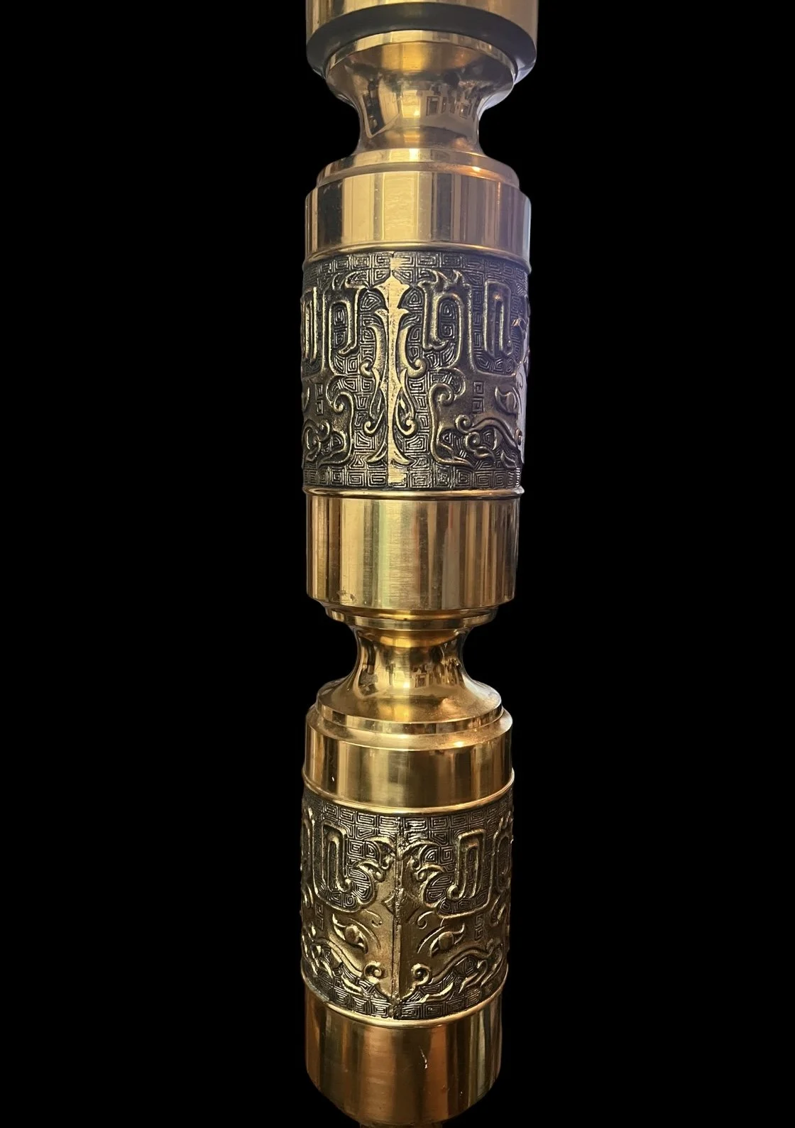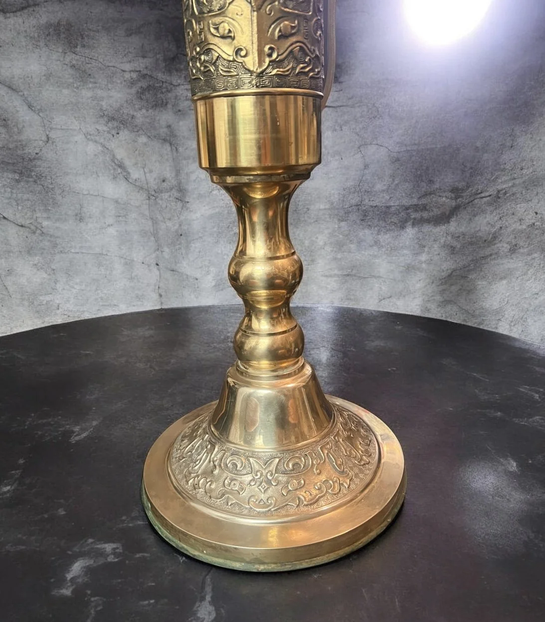 1960s vintage tall standing rotary phone, often described as a Hollywood Regency or Art Deco style pedestal telephone made of thick, ornate brass.