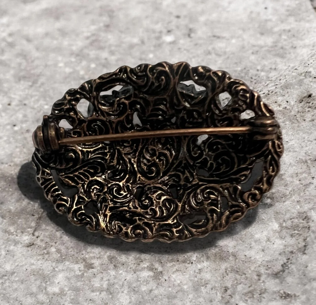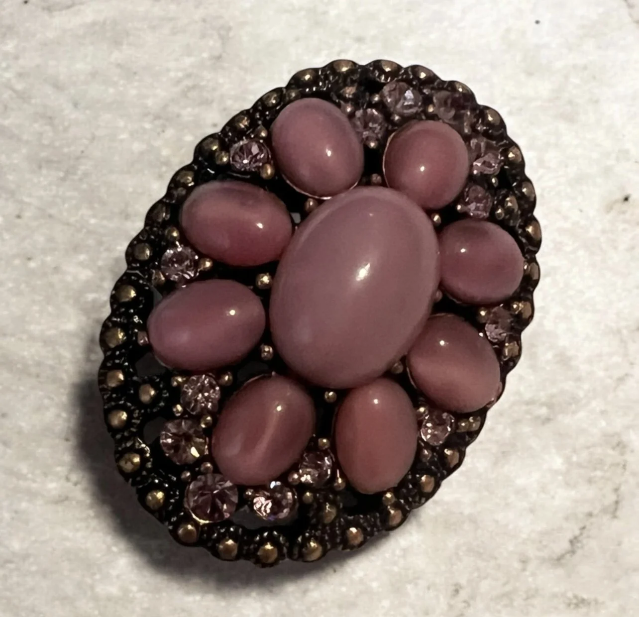 The pink resin stones are made to look like cabochon cut tiger eye effect stone. Such a beautiful and elegant design. I believe it was made in the 1950s or 1960s.
