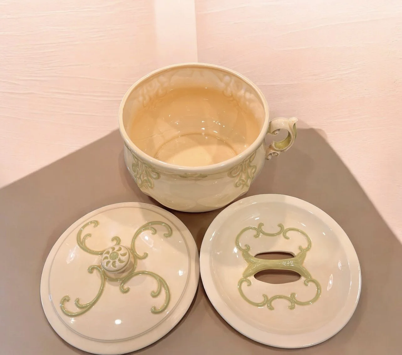However, they continued to be used in some households and also gained popularity as decorative collectibles or for nostalgic purposes. The three-piece design, including a splash cover, indicates a more refined version of the traditional chamber pot.